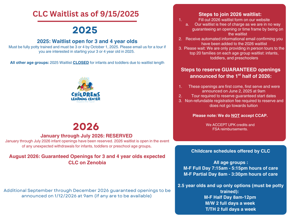 CLC provides care for all age groups: infants, toddlers and preschoolers. Please see above graphic for current waitlist.